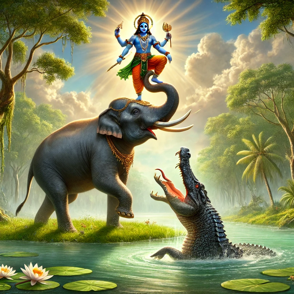 | విష్ణువు రక్షణ | గజేంద్రుని ప్రార్థనకు ప్రతిస్పందనగా శ్రీమహావిష్ణువు గరుడ వాహనంపై వచ్చి, తన సుదర్శన చక్రంతో మొసలిని సంహరించి, గజేంద్రునికి మోక్షాన్ని ప్రసాదిస్తాడు. |