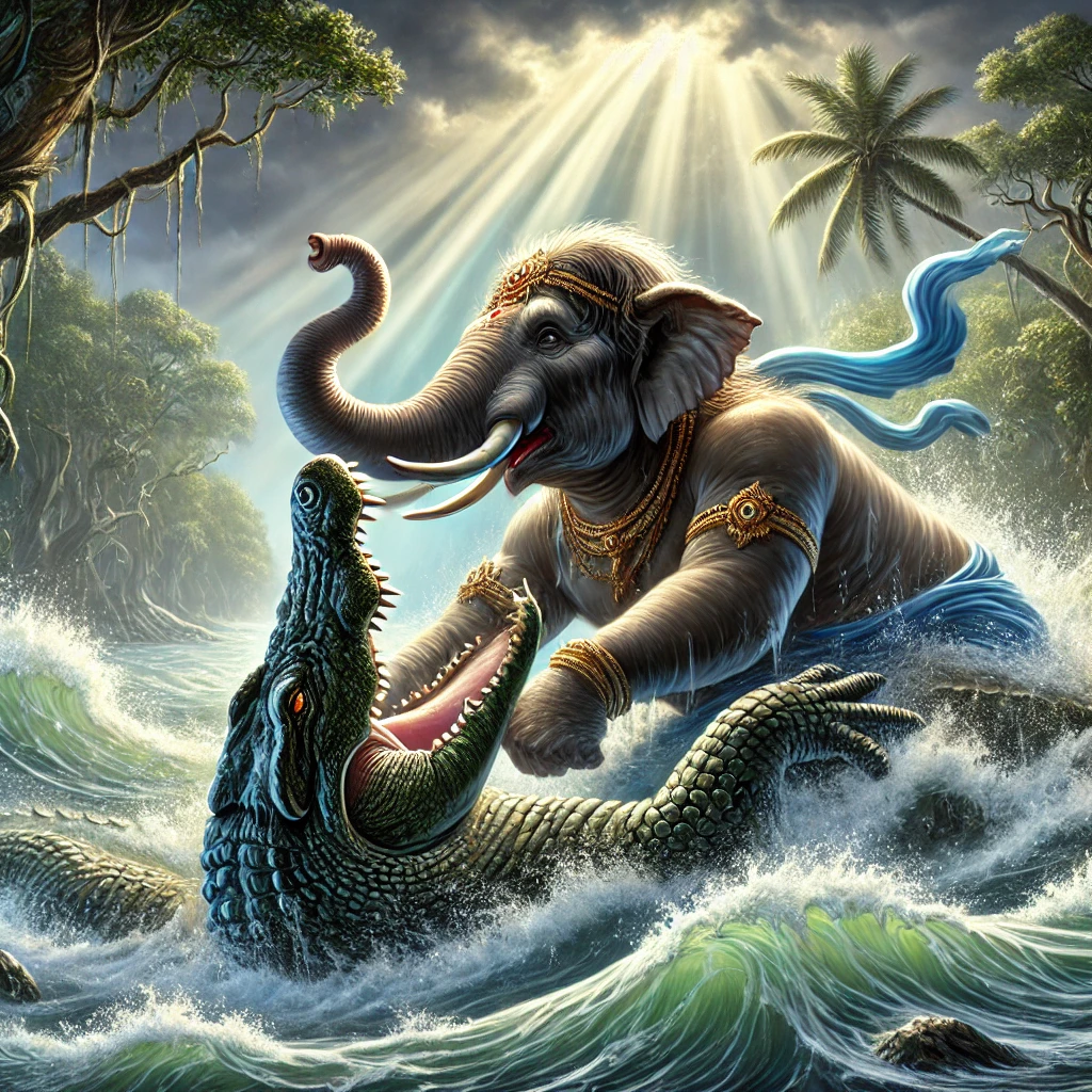 ఈ విధంగా గజరాజు ఆ కొలనులో క్రీడిస్తున్న సమయంలోనే ఆ మడుగులో ఎక్కడో ఒకమూల దాక్కున్న ఒక మొసలి రాజు ఆ గజరాజును చూశాడు. వెంటనే భుగభుగమనే పెద్ద పెద్ద శబ్దాలతో బుడగలు పుట్టి అలలు ఆకాశానికి ఎగిరే విధంగా పైకి ఎగిరాడు. ఆ కొలనులో ఉండే మొసళ్ళూ, ఎండ్రకాయలూ, చేపలూ భయపడిపోయేట్లుగా, లోకాలన్నింటికీ భయంకలిగేలా, వణుకువచ్చేలా పూత్కారం చేశాడు. గాలికి సుడిగుండాలు లేచేటట్లుగా తోకని జాడించాడు. ఆ సమయంలో వచ్చిన (పైకిలేచిన) అలల తాకిడిని సరస్సు ఒడ్డున ఉన్న చెట్లువ్రేళ్ళతో సహా పెకలించుకుని నేలపైకి కూలిపోయినాయి. ఒక్కసారిగా హుంకారం చేస్తూ పైకి ఎగిరాడు. ఆకాశ మధ్యలో విహరిస్తున్న సూర్యుని రాహువు ఎట్లా పట్టుకుంటాడో అట్లాగే, ఆ మొసలిరాజు ఈ గజరాజును ఒక్కసారిగా గట్టిగా పట్టుకున్నాడు.