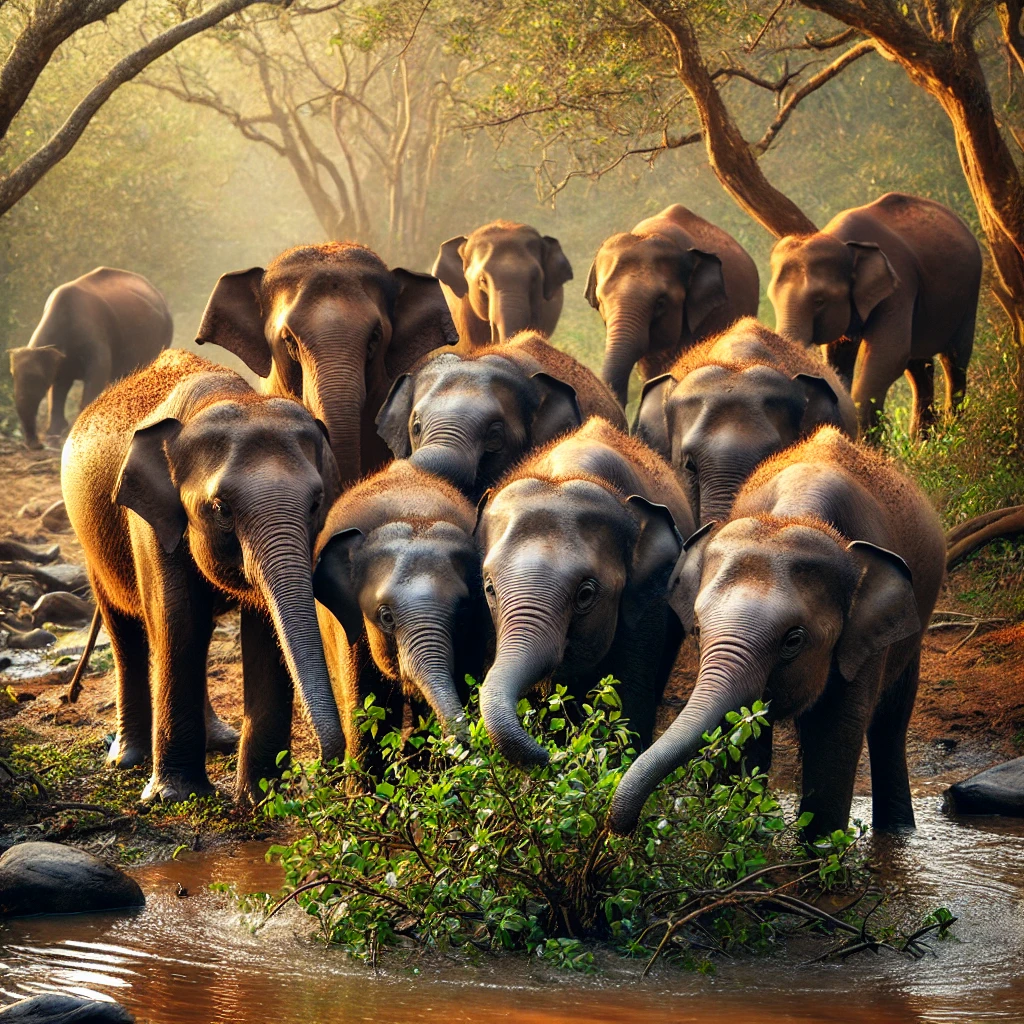 దాహం తీర్చుకోడానికి బయటకి వచ్చిన గున్న ఏనుగులు పాచిక బైళ్లను వాసనా చూస్తూ, పండ్ల చెట్లకు వాటి శరీరానికి రాసుకుంటూ, లేలేత చిగుళ్ళను నములుతూ, దున్న పోతులను దాటుకుంటూ, దున్న పోతులకు వెళ్ళడానికి దారి ఇవ్వకుండా తప్పించుకుంటూ తిరుగుతూ, మడుగులోకి దిగి, అందులోని నీటిలో అలజడి సృష్టిస్తూ ఆనందముగా ఆడుకుంటున్నాయి.