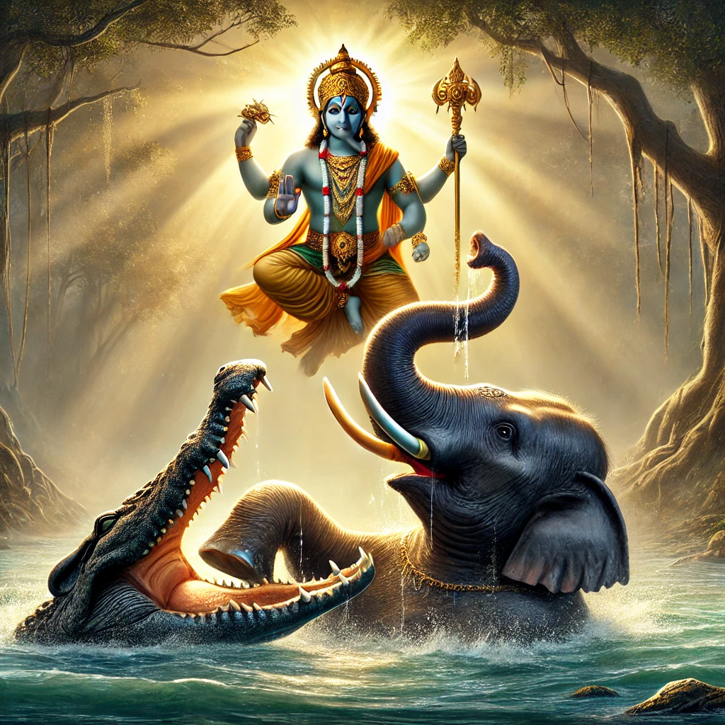పూర్వం, ఒక గజరాజు – ఒక ఏనుగు – దైవానుగ్రహంతో మెలగుతూ, దాహంతో ఒక సరస్సులోకి దిగింది. కానీ ఆ నీటిలో ఒక బలమైన మొసలి దానిని పట్టుకుని గట్టిగా లాగసాగింది. ఏనుగు ఎంత బలమైనదైనా, నీటిలో మొసలితో పోరాడలేకపోయింది, నిస్సహాయంగా నిలబడింది.