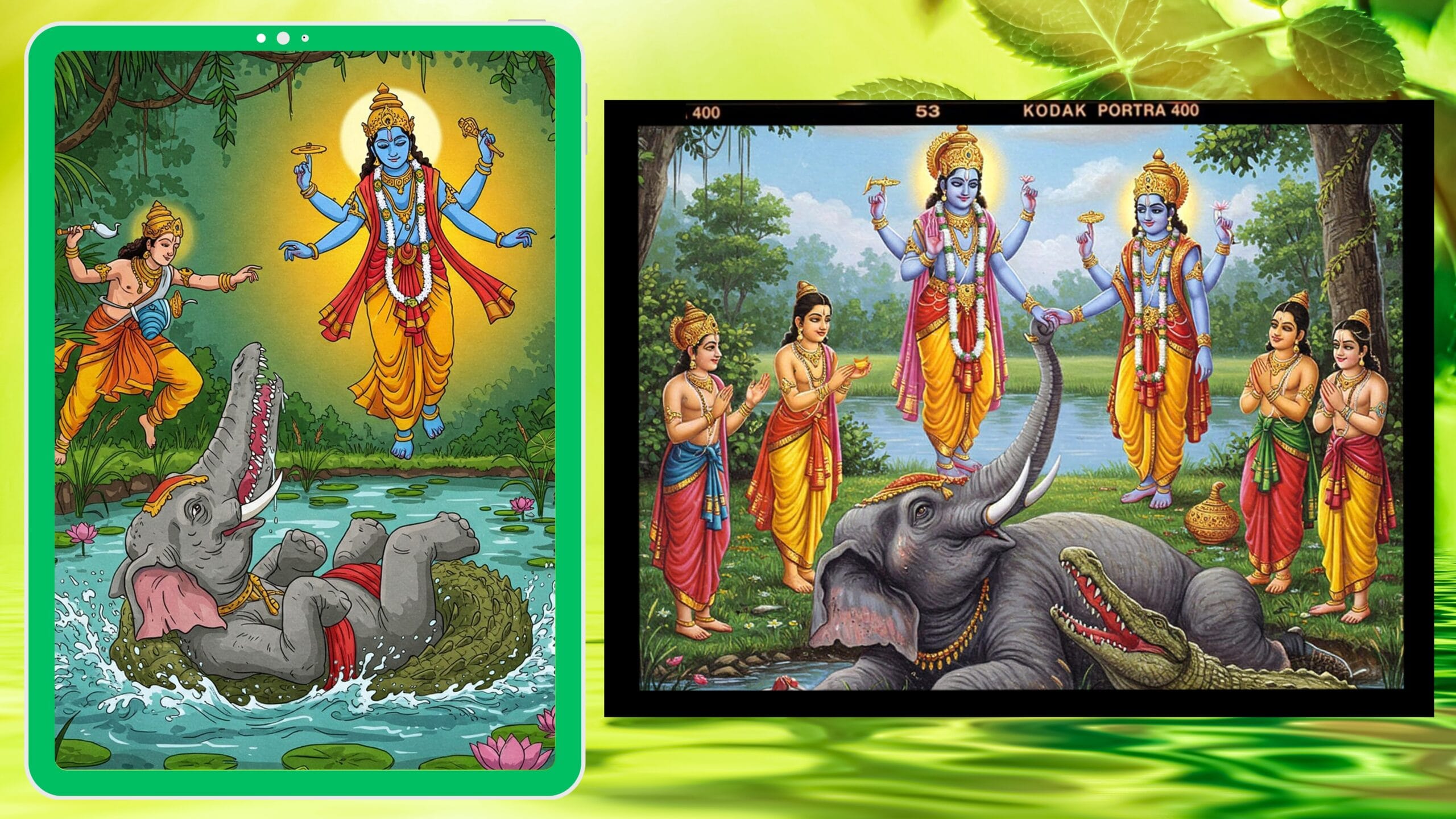 ఒకప్పుడు ఒక బలమైన ఏనుగు తన ప్రాణాల కోసం పోరాడుతూ, చివరికి పూర్తిగా భగవంతునికి శరణాగతి పొందింది. ఆ సమయంలో, ఆర్తితో కూడిన అతని పిలుపు విన్న శ్రీ మహావిష్ణువు తన గరుడ వాహనంపై వేంచేసి, తన దివ్యమైన పాంచజన్యాన్ని పూరించాడు. ఆ శంఖం యొక్క ధ్వని విశ్వాన్నే మార్చివేసింది – ప్రకృతి ఆనందంతో పులకరించింది, దేవతలు నృత్యం చేశారు.