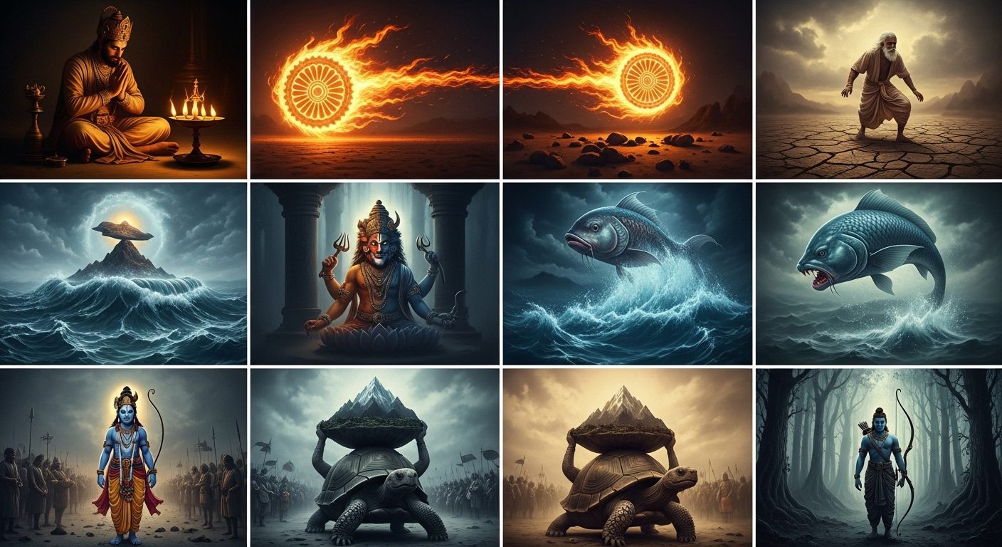 అచేతనాలైన పూజిత సంజ్ఞలలోంచి జడమైన విష్ణుచక్రం, దివ్యకాంతి ప్రభాశోభితమై తన వంకగా కదలి రావడాన్ని చూడగానే—దూర్వాసుడు త్రుళ్ళిపడ్డాడు. ఆ చక్రానికి చిక్కగూడదని భూచక్రమంతా గూడా క్షణాల మీద పరిభ్రమించాడు. అయినా ‘సుదర్శనం’ అతగాడిని తరుముతూనే వుంది. భీతావహుడైన ఆ దూర్వాసుడు—వశిష్ఠాది బ్రహ్మర్షులనీ, ఇంద్రాది అష్టదిక్పాలకులనీ, చిట్టచివరికి శివ-బ్రహ్మలనీ గూడా శరణుకోరాడు. కాని, అతని వెనకనే విహ్వల మహాగ్ని జ్వాలాయుతంగా వస్తూన్న విష్ణుచక్రాన్ని చూసి—ఎవరికి వారే తప్పుకున్నారే తప్ప విడిచి, తెగించి ఎవరూ అభయాన్నీయలేదు.