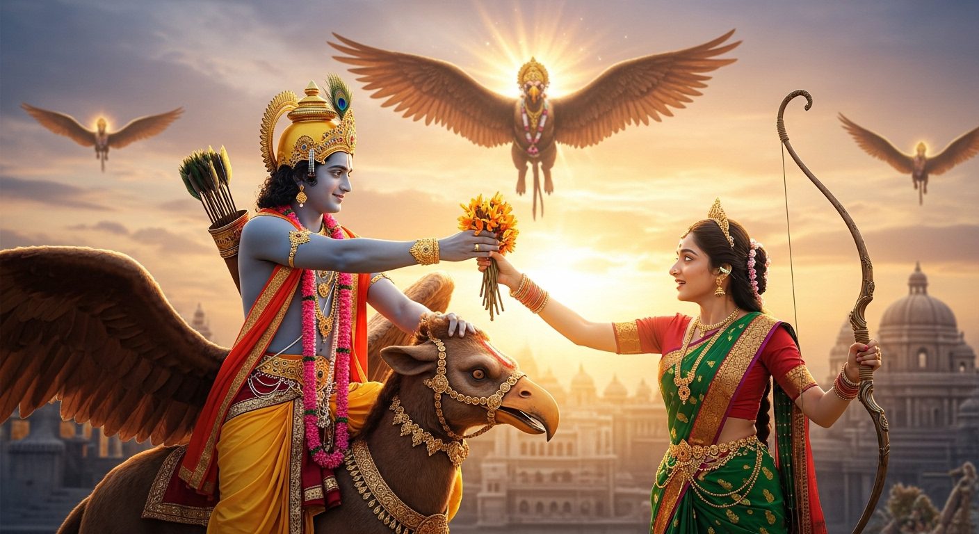 “అనంతరం శ్రీ మహావిష్ణువునైన నేను దేవతల ప్రార్థన మీద దేవకి గర్భాన ఇలా కృష్ణుడిలా అవతరించాను. నాతో బాటే అనేకమంది వైకుంఠవాసులు కూడా యాదవులుగా జన్మించారు. పూర్వజన్మలలోని ‘చంద్రుడు’ ఈ జన్మలో అక్రూరుడయ్యాడు. అలనాటి దేవశర్మ సత్రాజిత్తుగా ప్రభవించాడు. బాల్యం నుంచే కార్తీకవ్రతం మీదా, నా మీదా మాత్రమే మనసు లగ్నం చేసిన గుణవతే – నువ్వుగా – అంటే సత్రాజిత్ కుమార్తవైన సత్యభామగా ఇలా జన్మించావు”.
