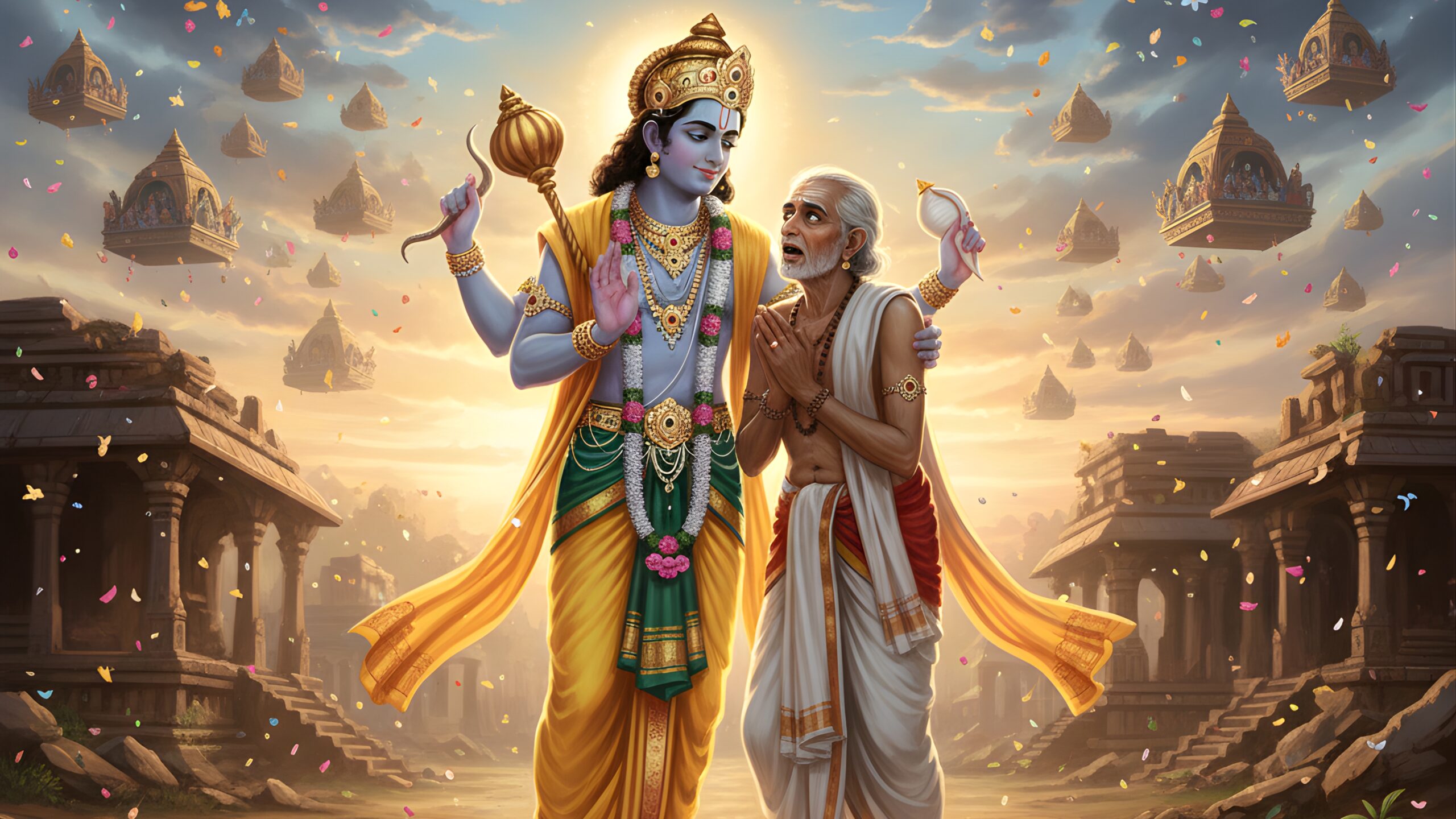 ఇప్పుడితను విష్ణుదాసుని కళ్లకు – శంఖచక్ర గదాబ్జధారీ, పీతాంబరుడూ, చతుర్భుజుడూ, శ్రీవత్సలాంఛితుడూ, కౌస్తుభాలంకృతుడూ అయిన శ్రీమన్నారాయణుని వలే గోచరించడంతో అతగాడు స్వాత్త్వికభావా వృతుడై పోయి – అవాక్కుగా వుండిపోయాడు. ఈ భక్త భగవానుల సంగమ దర్శనార్ధం ఇంద్రాదులెందరో విమానారూఢులై ఆ ప్రాంతాలకకు వచ్చారు. విష్ణువు మీదా, విష్ణుదాసుడి మీదా కూడా విరివాన కురిపించారు. అప్సరసలు ఆడారు. గంధర్వులు పాడారు. దేవగణాల వందలాది విమానాలతో ఆకాశం నిండిపోయినట్లనిపించింది.