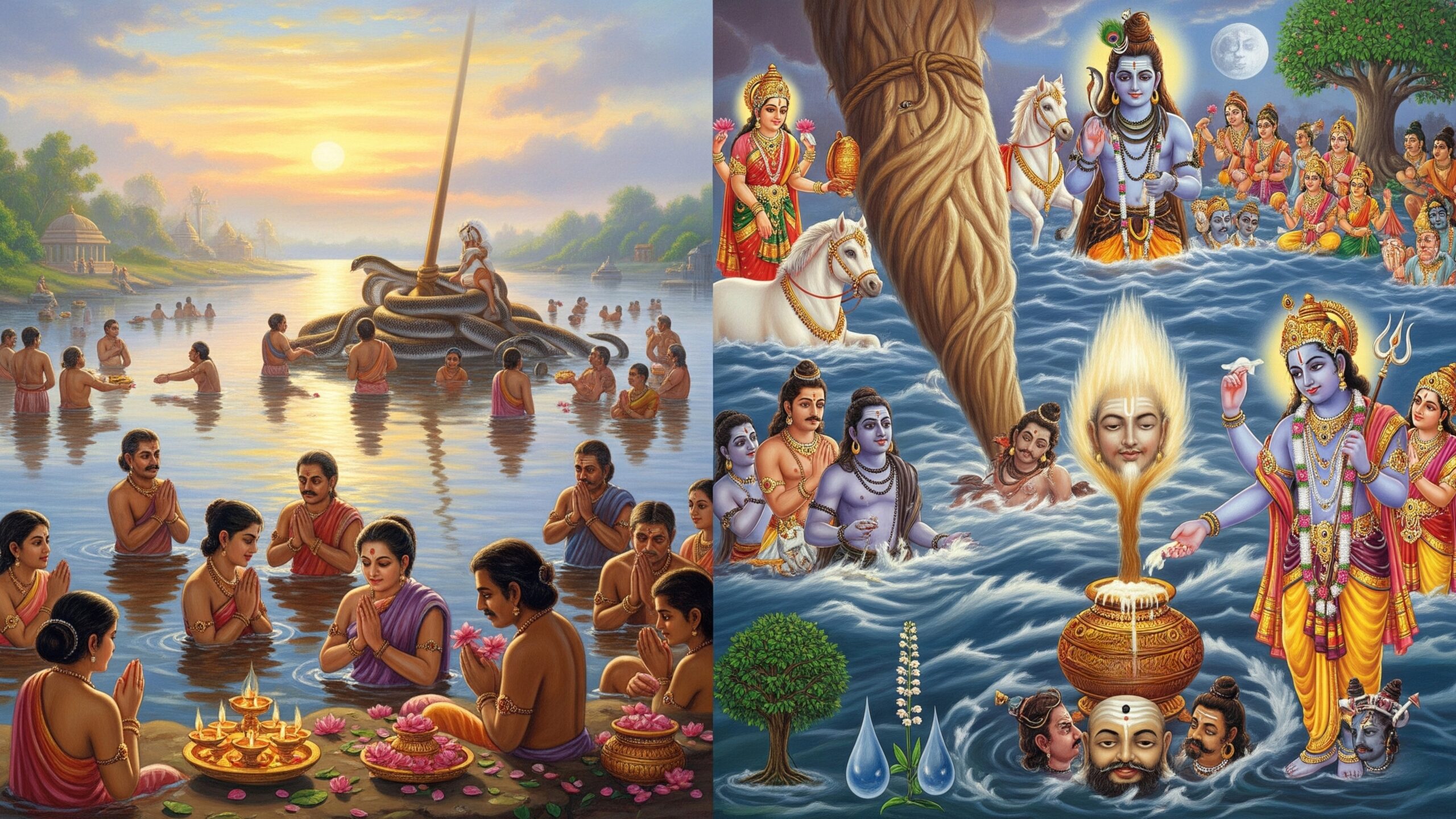 పూర్వం దేవతలు, రాక్షసులు అమృతం కోసం క్షీరసాగరాన్ని మథించాలని సంకల్పించారు. వారు మంధర పర్వతాన్ని కవ్వంగా, వాసుకి అనే సర్పమును తాడుగా ఉపయోగించి మథనం ప్రారంభించారు. ఈ మథనంలో అనేక దివ్య వస్తువులు, దేవతలు ఉద్భవించారు.