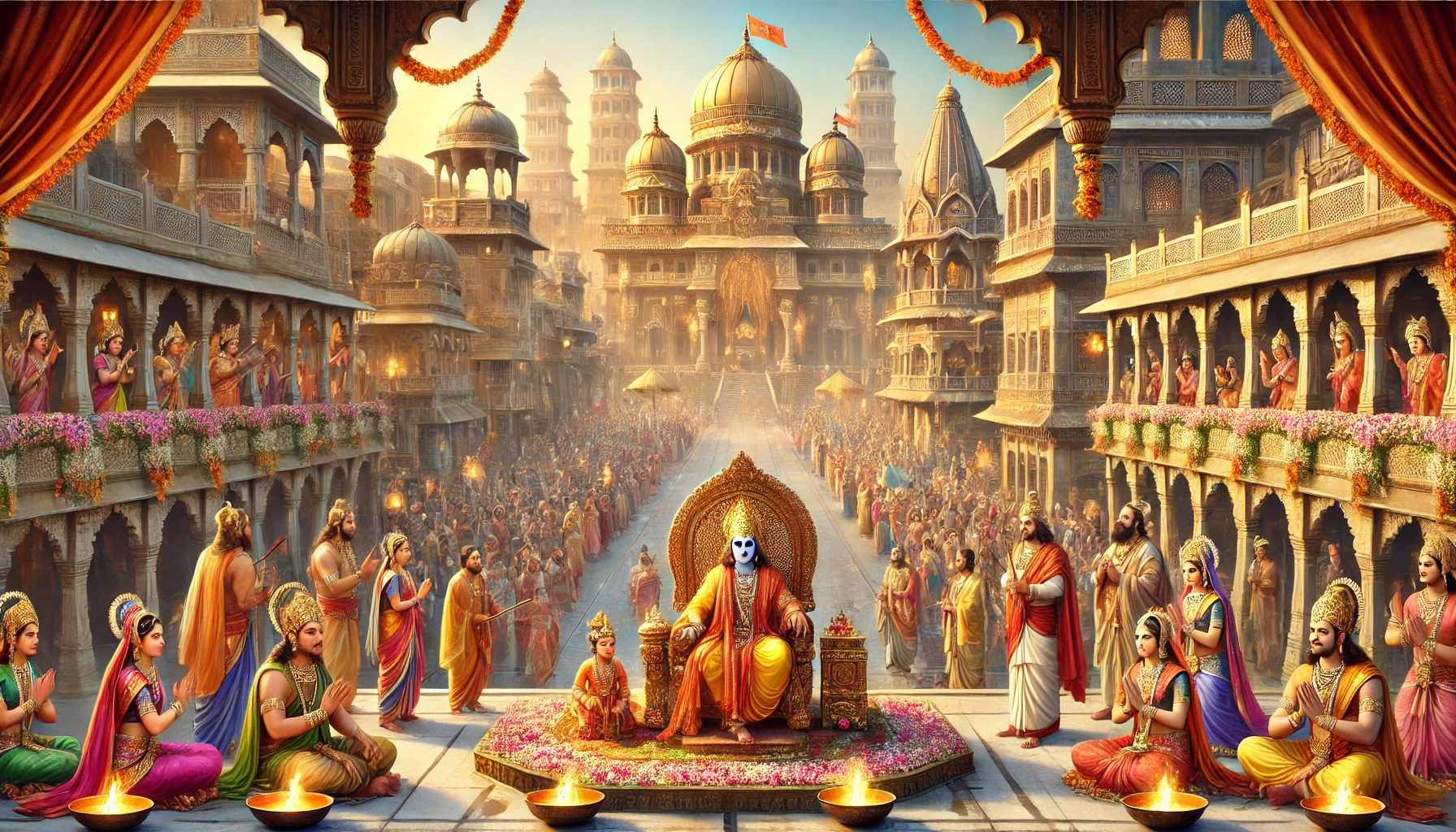 Ramayanam Story in Telugu – అయోధ్య నగర ప్రజలు రాముని పట్టాభిషేకం జరుగుతుందని తెలిసి ఆనందంతో మునిగిపోయారు. ప్రతి ఇంటి ముందూ కళ్ళాపి చల్లి, రాత్రివేళ పట్టాభిషేకం జరుగుతుందని చెట్లను దీపాలతో అలంకరించారు. నటులు, గాయకులు పాటలు పాడుతూ, నాట్యం చేస్తూ పరవశించిపోయారు. ప్రజలందరూ మంచి వస్త్రాలు ధరించి ఆనందంగా సంబరాలు చేసుకుంటున్నారు. కౌసల్య ఆనందానికి అవధులు లేకుండా పోయాయి. ఆమె గొప్ప గొప్ప దానాలు చేసి, శ్రీ మహావిష్ణువును ఆరాధించింది.