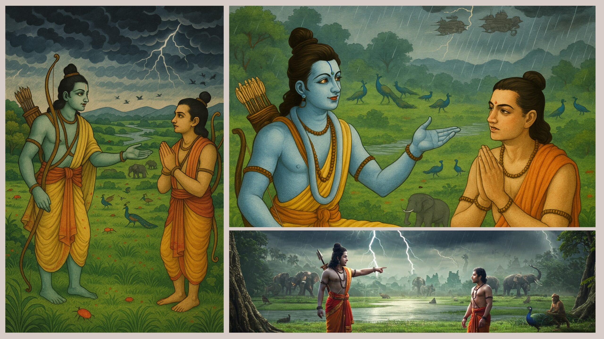 వర్షాకాలాన్ని చూసి రాముడు లక్ష్మణుడితో ఇలా అన్నాడు: “లక్ష్మణా! ఈ వర్ష ఋతువులో విస్తారంగా వర్షాలు కురవడం వల్ల భూమిపై పచ్చటి గడ్డి ఏపుగా పెరిగింది. నేలంతా పచ్చదనంతో నిండి ఉంది. భూమి మీద ఎర్రటి ఇంద్రగోప పురుగులు అక్కడక్కడ తిరుగుతుండగా, ఆ దృశ్యం భూదేవి ఎర్రటి చుక్కలున్న పచ్చని చీర కట్టుకున్నట్లుగా ఉంది. నదులన్నీ నీటితో నిండుగా ప్రవహిస్తున్నాయి. మేఘాలు దట్టంగా కురుస్తున్నాయి.