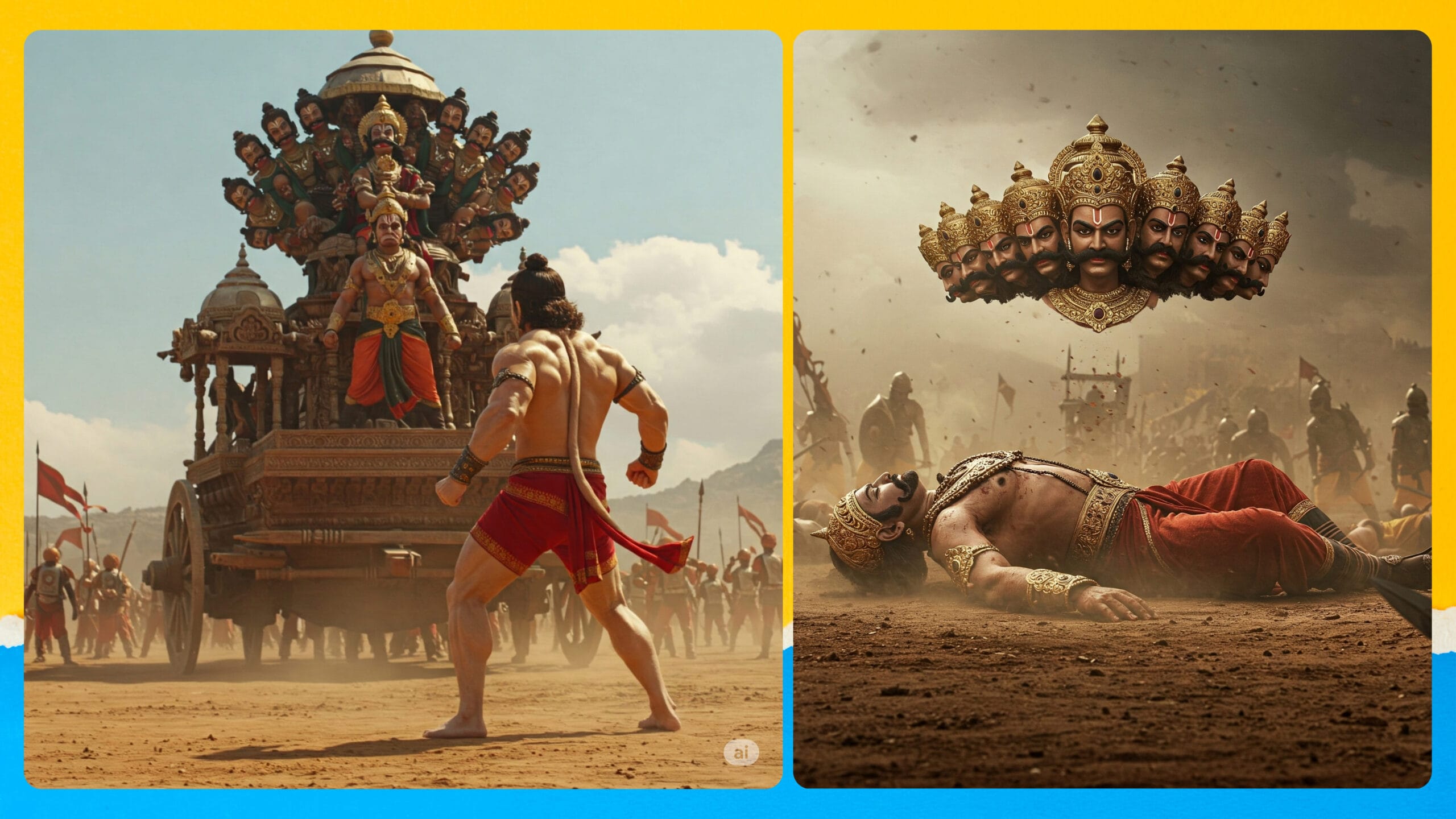 రాముడు హనుమ మీద కూర్చొని యుద్ధానికి వెళ్ళి ” దురాత్ముడా! ఆచారభ్రష్టుడా! పర స్త్రీని అపహరించినవాడా ! ఈ రోజు నువ్వు అంతఃపురంలోకి వెళ్ళవు. ఇవ్వాళ నీ పదితలకాయలు కొట్టేస్తాను…………” అని రాముడు చెబుతుండగా రావణుడు విశేషమైన బాణ పరంపరని హనుమంతుడి మీద కురిపించాడు.