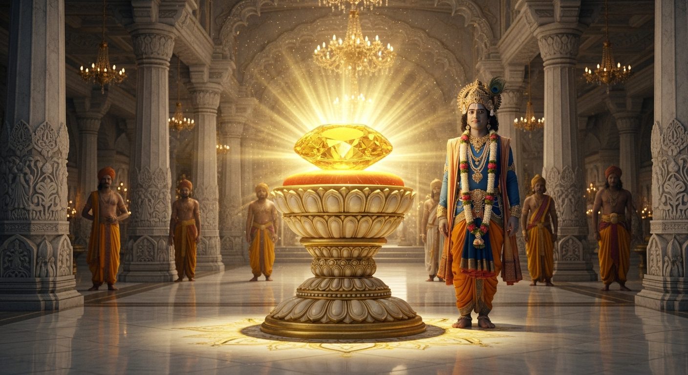 ఒకరోజు, శ్రీకృష్ణుడు, బలరాముడు ద్వారకలోని తన అంతఃపురంలో ఉన్నారు. అదే సమయంలో, యాదవుల ప్రముఖుడైన సత్రాజిత్తు అద్భుతమైన తేజస్సుతో నగరంలోకి అడుగుపెట్టాడు. అతని మెడలో ఉన్న ఒక మణి నుంచి వెలువడిన కాంతి చూసి, నగరవాసులందరూ అతన్ని సాక్షాత్తు సూర్యభగవానుడే వచ్చాడని పొరపడ్డారు. పరుగుపరుగున వెళ్లి ఈ విషయాన్ని శ్రీకృష్ణుడికి తెలిపారు.