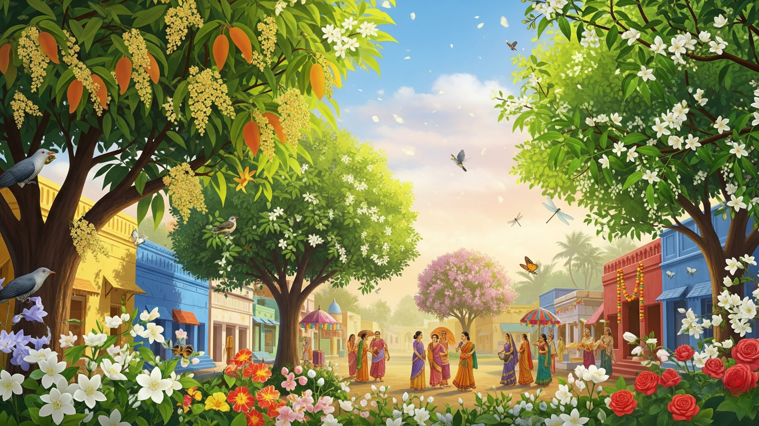 - మామిడి, వేప, మల్లె, గులాబీ వంటి వివిధ రకాల పువ్వులు వికసిస్తాయి.